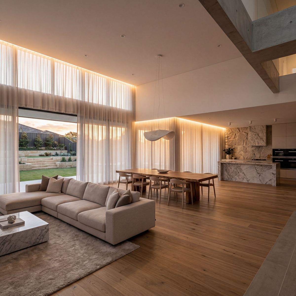 A refined architectural lighting system designed to integrate seamlessly with modern sheer curtains — transforming light into atmosphere.